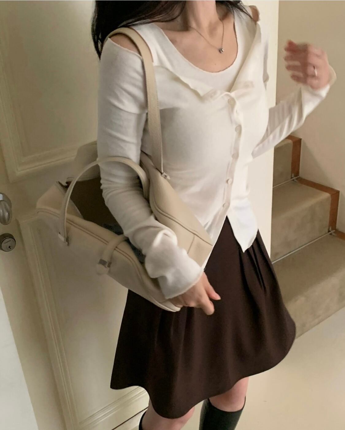 ・ボタンを全部閉めたスタイルも良いですし、ボタンを2つ程オープンしてナチュラルで自然なオフショルダースタイルを演出するのも◎
