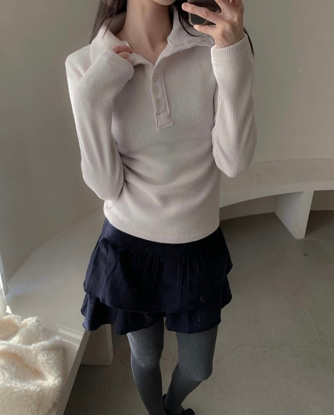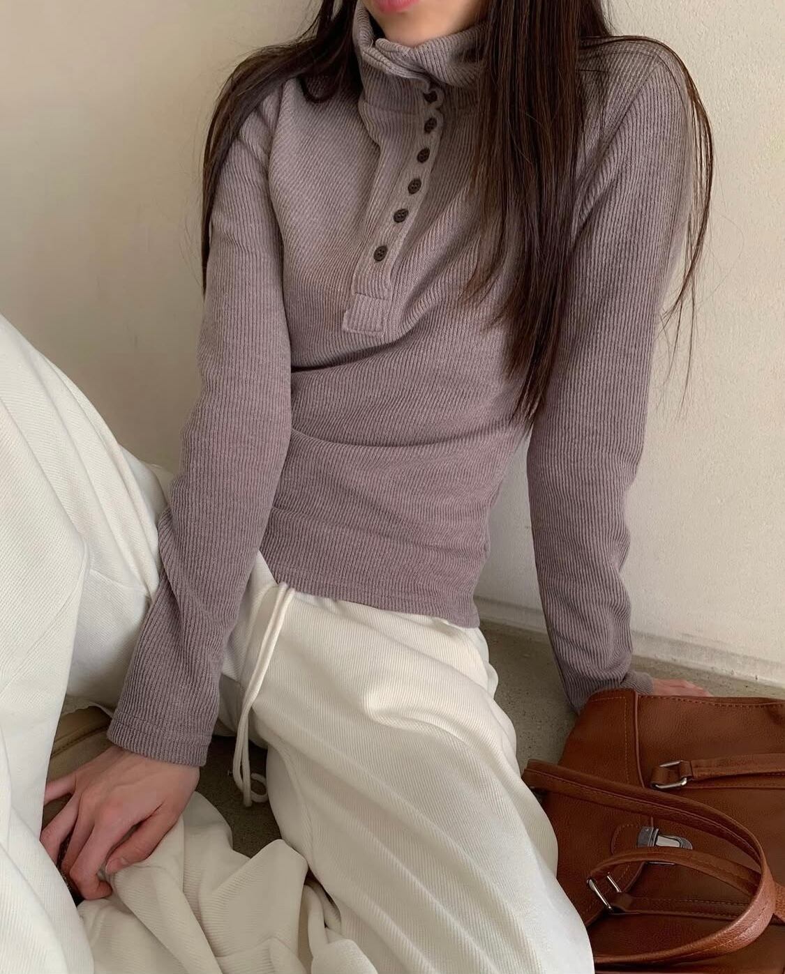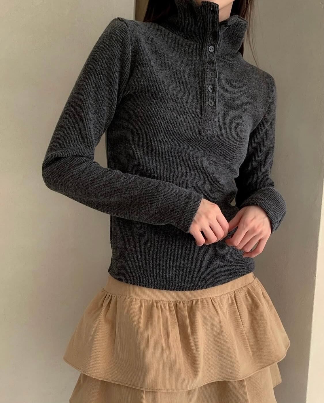 ・正面のボタンは合わせるアイテムによって調整することで、ポロニットのように着用やボタンを全部閉めてタートルネックスタイルも◎