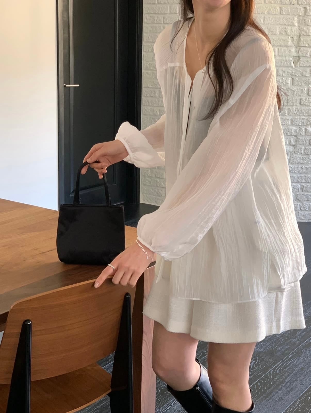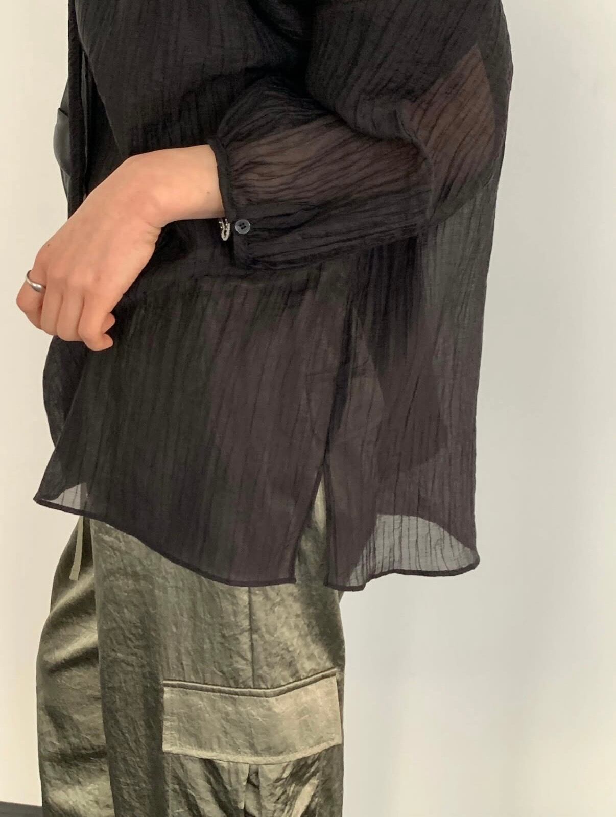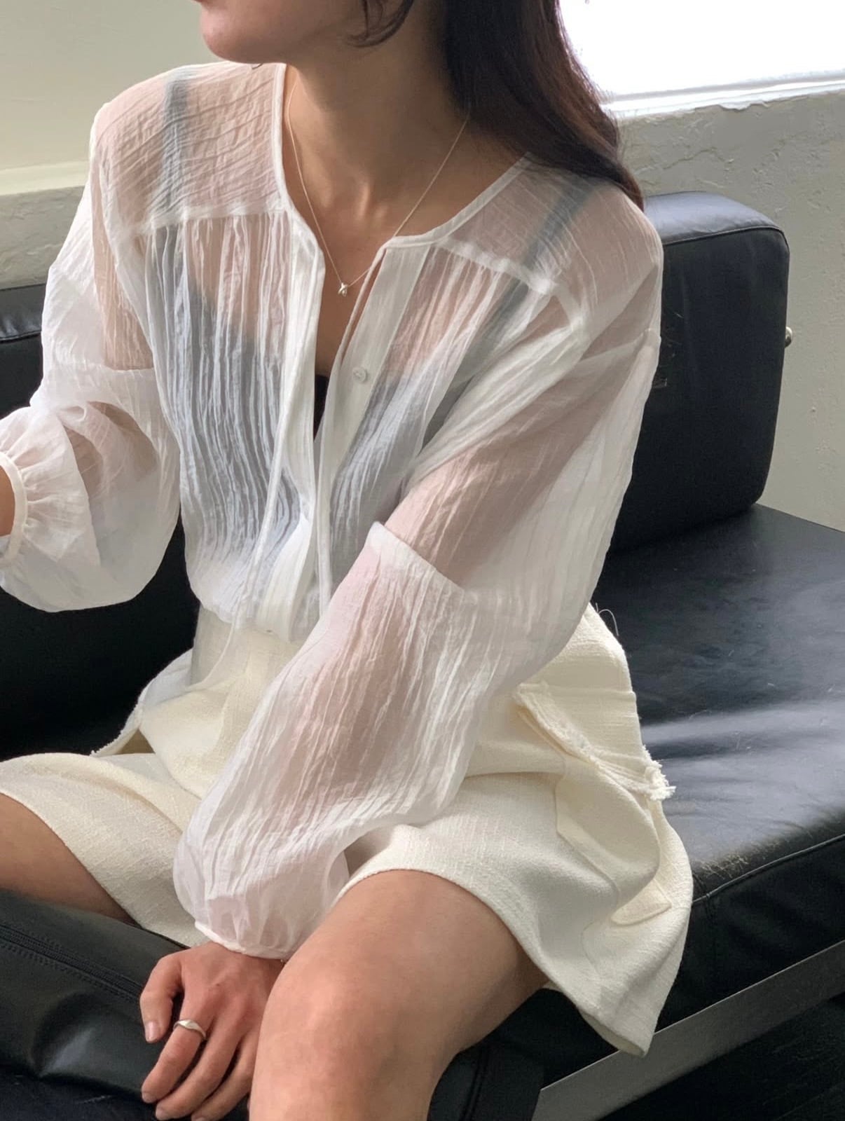・ボクシーなシルエットにリボン紐ディテールを加えたシアーブラウス