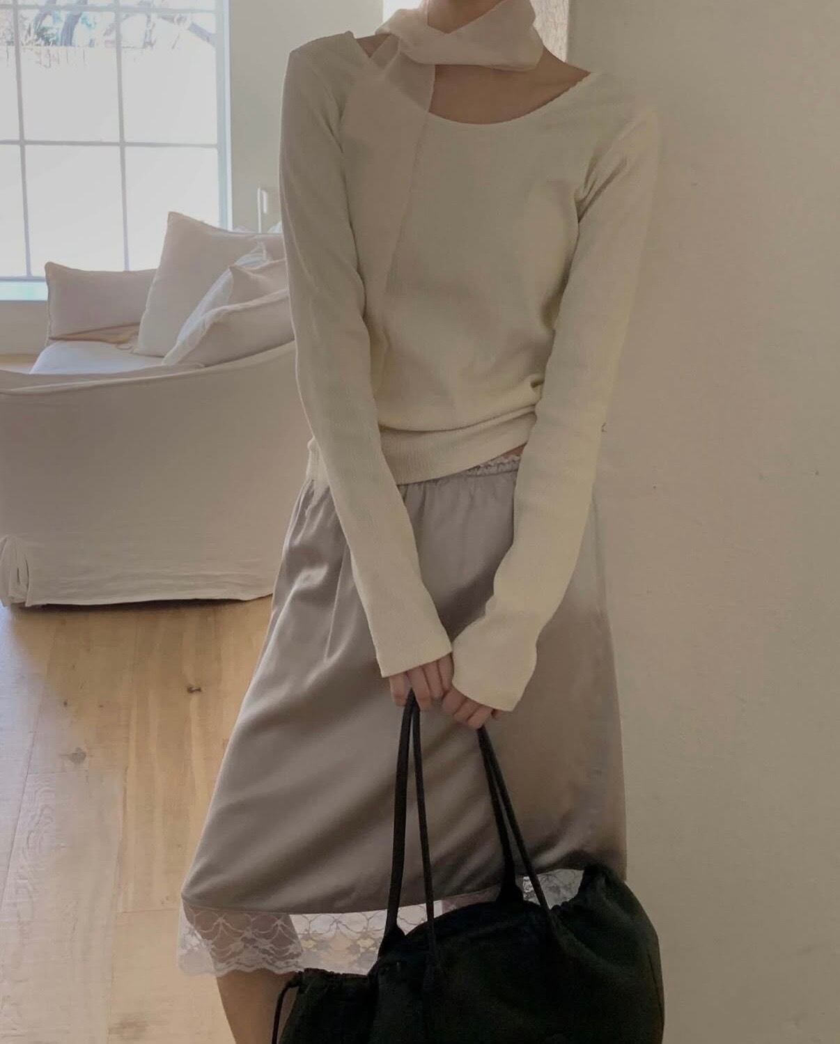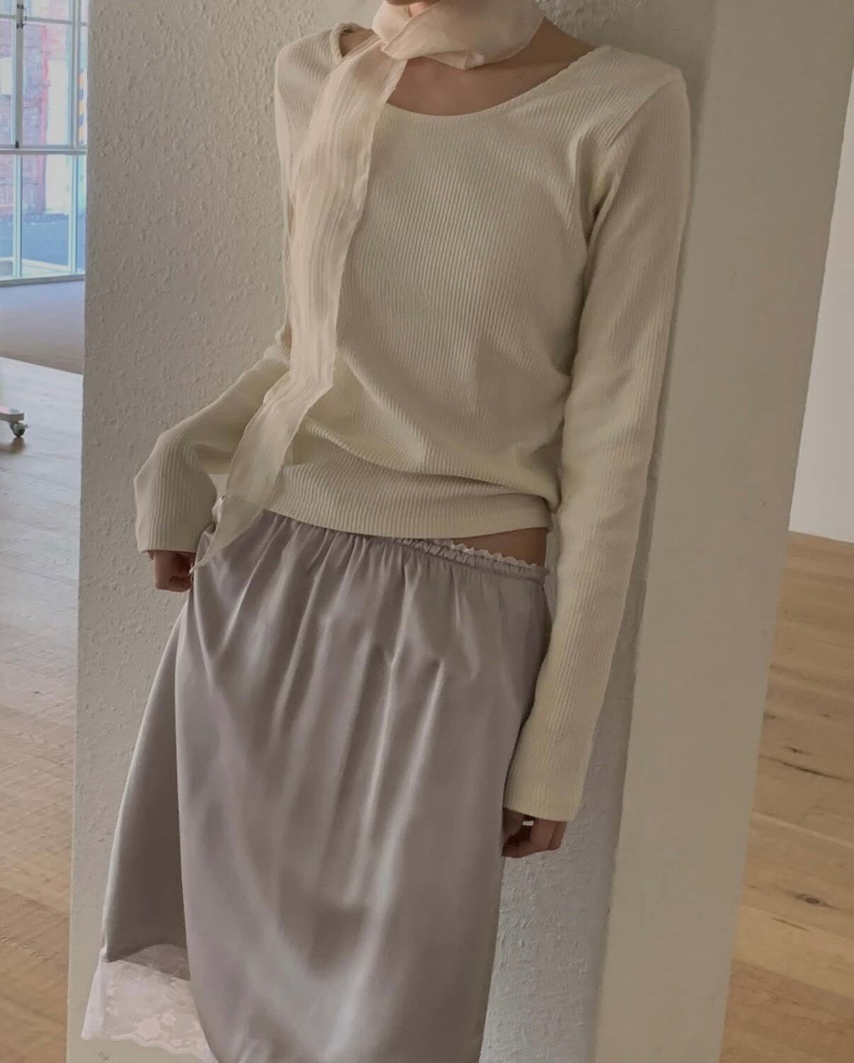 ・シンプルで女性らしい雰囲気が感じられるリブニットはやや広めにオープンされたネックライン