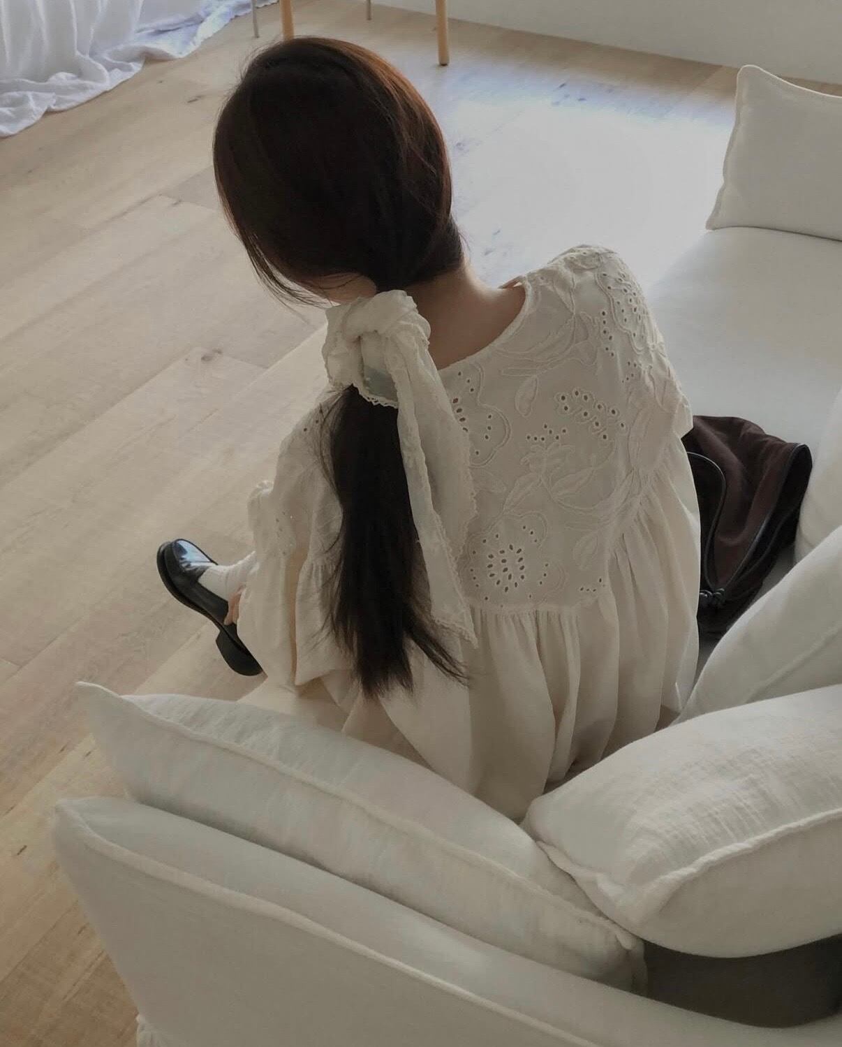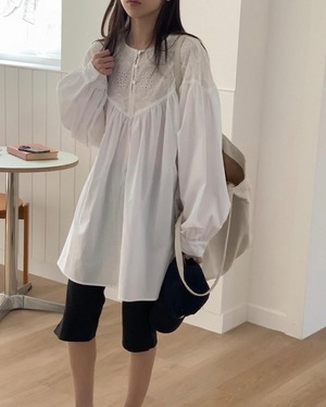 ・たっぷりと贅沢に寄せたギャザーは、落ち感のある素材を使用しているのでボリューム感が抑えられ、すっきり見えするのも魅力