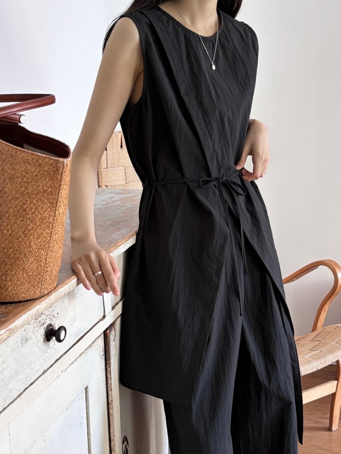 ・ウエスト紐でメリハリのあるスタイル、ばさりと着用して抜け感のあるスタイル、どちらもサマになる